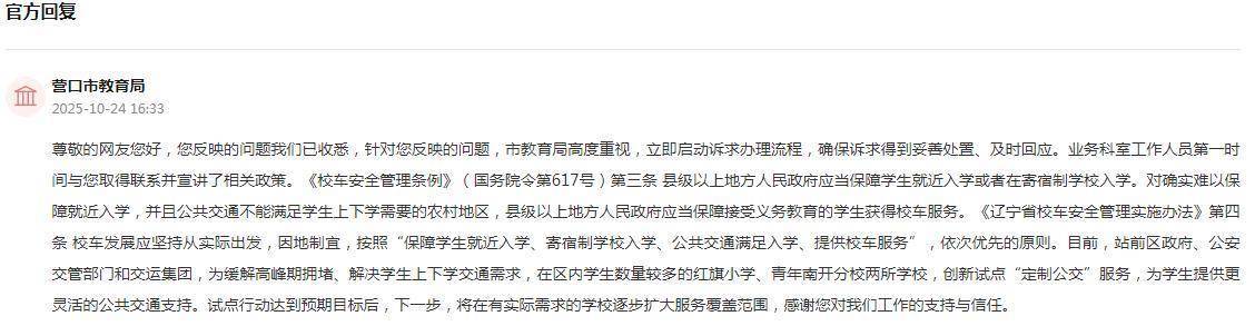 在回复中,营口市教育局表示:目前,站前区政府、公安交管部门和交运集团,为缓解高峰期拥堵、解决学生上下学交通需求,在区内学生数量较多的红旗小学、青年南开分校两所学校,创新试点“定制公交”服务,为学生提供更灵活的公共交通支持。试点行动达到预期目标后,下一步,将在有实际需求的学校逐步扩大服务覆盖范围,护航学生上下学的同时,也缓解家长的接送压力。