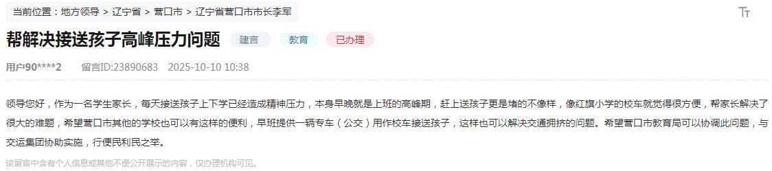近日,辽宁营口的网友在人民网“领导留言板”上留言诉苦,早晚高峰接送孩子令自己倍感压力,建议相关部门能够帮忙解决难题。